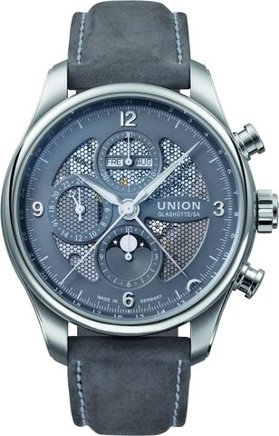 The moon phase display, one of the most traditional complications, receives a contemporary appearance through Union Glashütte. The two-layer dial design with honeycomb structure offers fascinating insights into the movement components. A discreet corrector at 10 o'clock allows separate adjustment of the day of the week. Double-sided anti-reflective sapphire crystal and water resistance up to 10 bar emphasize the outstanding features of this watch. The gray nubuck leather strap completes the overall picture.