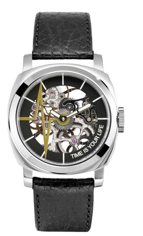 Het TIYL skeletuur is uitgerust met een mechanisch uurwerk met handopwinding, en dat heeft een bijzondere reden. Het dagelijkse ritueel van het draaien aan de kroon om het horloge op te winden, biedt momenten om even stil te staan, de tijd voor een kort ogenblik te stoppen en ervan te genieten. De gekleurde polsslag op de wijzerplaat nodigt ons uit om aan bijzondere tijden te denken en van het leven te genieten. Deze ritus creëert een heel bijzondere verbinding tussen de drager en zijn horloge.