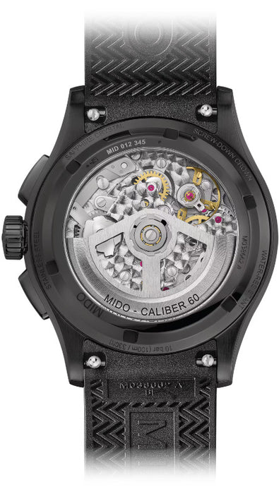 Der Multifort Skeleton Chronograph vereint modernste Uhrentechnologie mit klassischer Schweizer Handwerkskunst. Das Herzstück der Uhr ist das neue Kaliber 60 A05.951, ein skelettiertes Automatik-Chronographenwerk, das speziell für Mido entwickelt wurde – sichtbar durch das markante offene Zifferblatt und den transparenten Gehäuseboden.