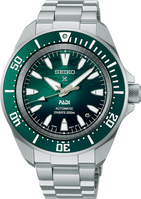 Ein Highlight der Kollektion ist die Sonderedition in Zusammenarbeit mit PADI (Professional Association of Diving Instructors). Das smaragdgrüne Zifferblatt mit Farbverlauf erinnert an den Blick eines Tauchers zur Wasseroberfläche, wo Licht auf Wellen trifft. Diese besondere Gestaltung unterstreicht Seikos nachhaltiges Engagement für den Schutz der Ozeane und seine langjährige Partnerschaft mit PADI.
