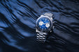 • Zifferblatt: Blau mit Dégradé-Effekt, silberne Totalisatoren