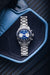 Das Dégradé-Zifferblatt in leuchtendem Blau ist ein echtes Highlight: In der Mitte hell strahlend, dunkelt es zum Rand hin ab – ein Effekt, der durch das bombierte, beidseitig entspiegelte Saphirglas perfekt zur Geltung kommt. Die silberfarben abgesetzten Totalisatoren bei 3 und 9 Uhr sorgen für gute Ablesbarkeit, während sich die Datumsanzeige dezent einfügt.